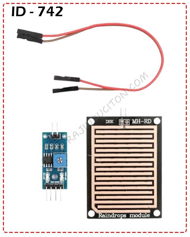 Raindrop Sensor is a tool used for sensing rain. It consists of two modules, a rain board that detects the rain and a control module, which compares the analog value, and converts it to a digital value. The Rain Drop Sensor Module can be powered with +5V and has both digital and analog output pins. The digital pin will remain high when there is no rainfall or water present on the detection plate. When a slight amount of water is detected the digital pin will go low and remain there until the water is cleared. The Raindrops module also has an LED to indicate the output status of the sensor and a potentiometer to control the sensitivity of the sensor. The analog pin outputs analog voltage based on the amount of water present on the detection plate. It is used in automation tasks like windshield wipers, automatic window closing in case of thunderstorm or adjust room temperature, in agriculture sector to plan the watering of the crops etc.
